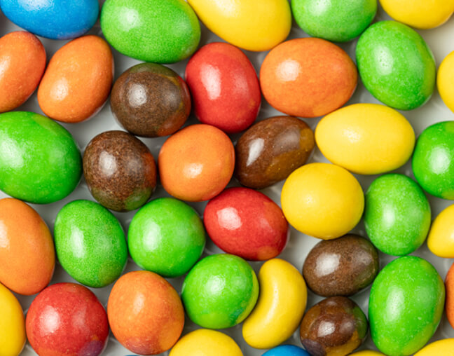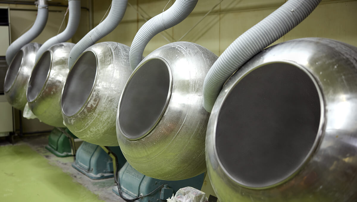 グミ・チョコレート・ガム・ラムネなどを砂糖でコーティングし、色付け・艶付けなど仕上げ加工します。